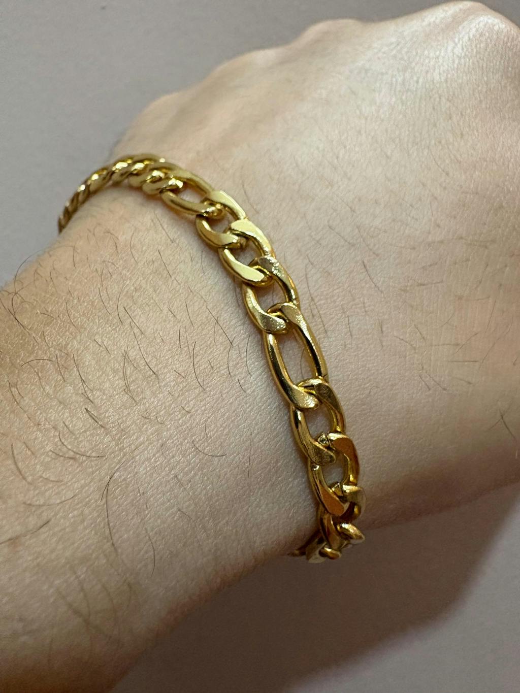 Designed with a signature Figaro link silhouette and coated in rich 18K gold plating, this bracelet delivers a deep, mirror-like shine that speaks of pure prestige. Its smooth, fluid form wraps around the wrist with effortless comfort, while the bold gold tone elevates every look from tailored fits to evening wear.